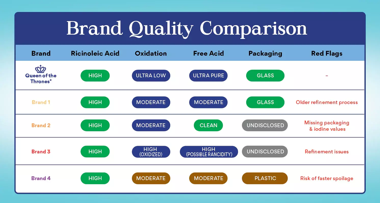 At Queen of the Thrones®, we believe you deserve more than marketing claims. You deserve Castor Oil that’s been tested, validated, and transparently shared with you—so you can feel confident in every drop you use on your skin and in your rituals.